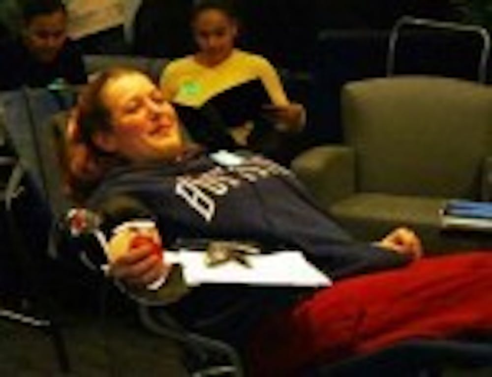 Stephanie Vail, a sophomore biomedical science major, gives blood during the American Red Cross Blood Drive on Tuesday in the Student Union.