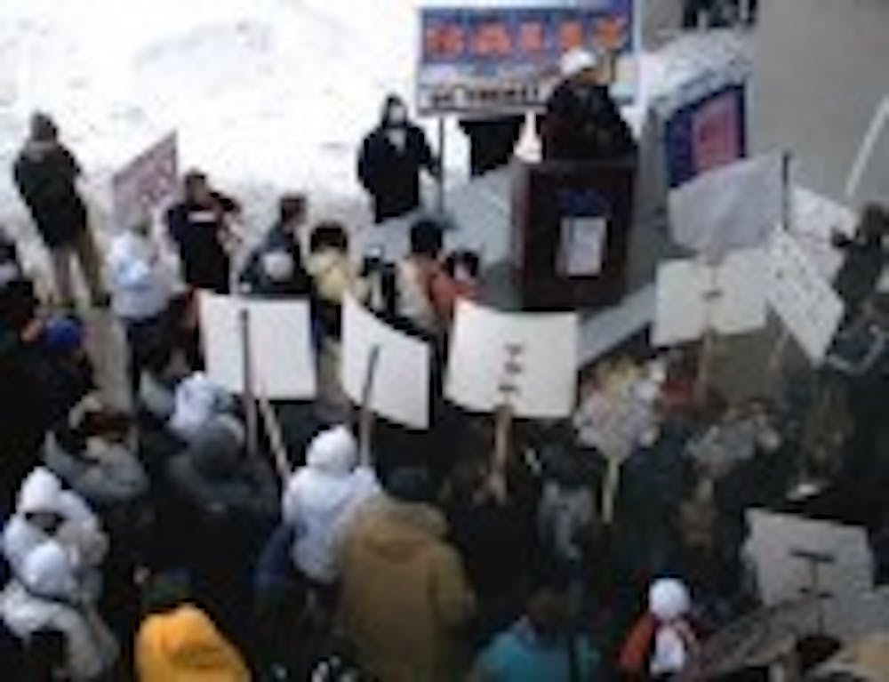 Nearly 75 students - bundled in hats, scarves and thick winter jackets - braved the cold Tuesday to attend a Student Association-sponsored rally protesting Gov. George E. Pataki's proposed $1,200 SUNY tuition increase and cuts to financial aid programs such as the Tuition Assistance Program and the Educational Opportunity Program.
