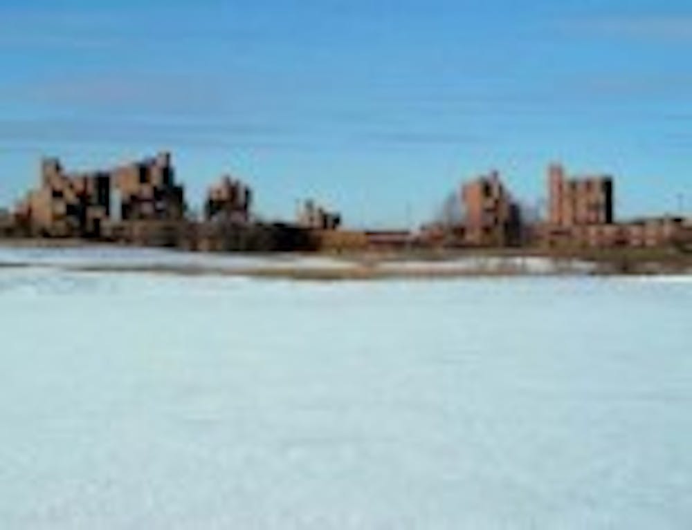Frozen Fun: On Friday, it was cold enough - and Lake LaSalle was frozen enough - to walk across the surface and look back on campus.