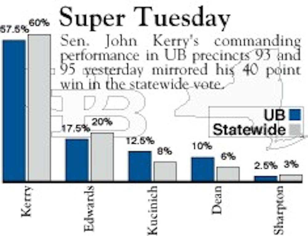 According to data from the Erie County Board of Elections, Sen. John Kerry had the strongest showing at UB on Super Tuesday, taking 57.5 percent of the vote in a precinct that includes Creekside Village, the Ellicott Complex, the Governors Residence Halls, and Hadley Village.