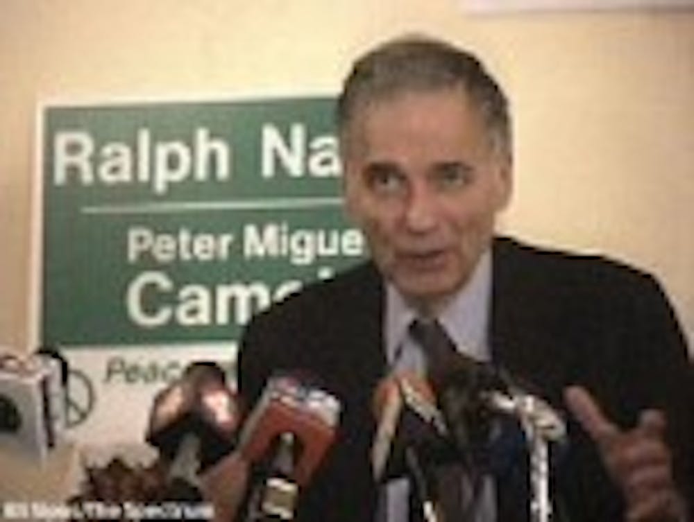 "You will never hear Kerry or Bush talk about the shifting of too much power to corporations, of there being too much corporate power," Nader said.
