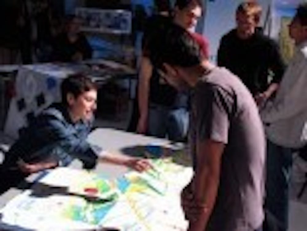 The German-born resident-alien also had a piece from her "Immigration Series" on display. It was a patterned mixture of cut-up U.S. Immigration papers and Islamic-patterned artwork. The work was stamped with red airplanes in memory of Sept. 11.
