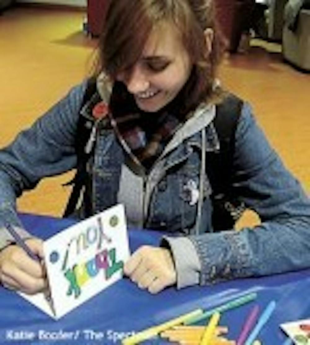 Stickers, stencils and markers of every color turned blank white cards into morale and support for American troops overseas on Wednesday in the Student Union.