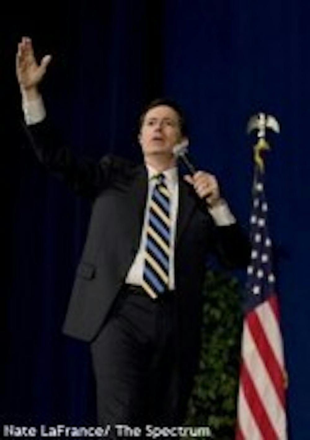 Tearing UB students from their laptops and thousands of Buffalonians from their television screens, political satirist and television personality Stephen Colbert took the Alumni Arena stage with no particular agenda, speaking his mind in a slightly different style.
