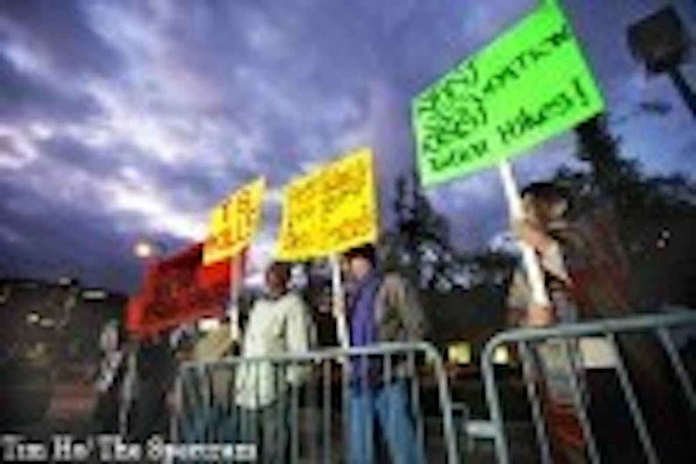 As thousands of students and community members approached Alumni Arena on Wednesday night, they were met with the steady drumbeat and megaphone from the Buffalo chapter of the Peace, Justice and Anti-War Coalition.