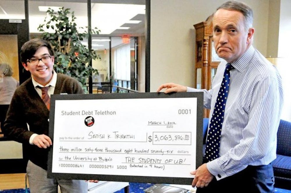 Buffalo's chapter of New York Students Rising – the Defend Our Education Coalition – wrote the check to raise awareness about the amount of debt students at UB will graduate with. The $3,063,876 on the fake check was raised in a mock telethon where "donations" were "given" in the form of debt that students have accumulated.