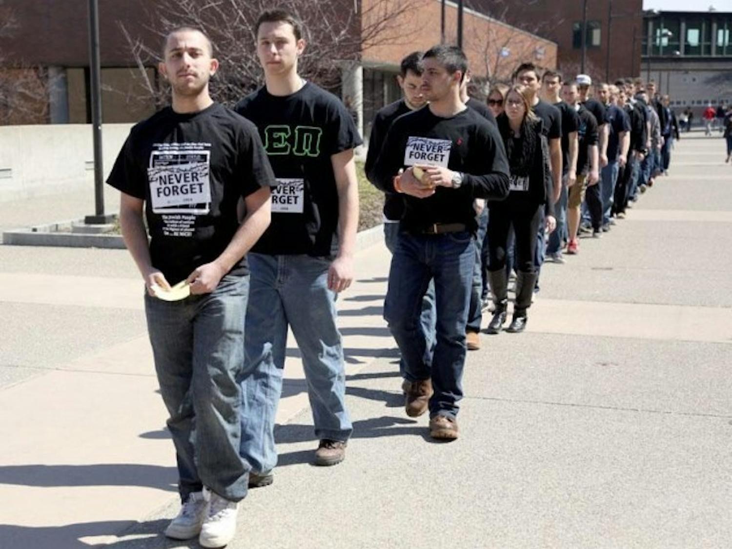 By LISA KHOURY | Apr. 9, 2013Students and faculty stared at Brian Kupferberg and 30 of his Jewish fraternity brothers who walked around school in a single-file line in complete silence, dressed in all black, on Monday afternoon. As they walked around a crowded North Campus, a student in Capen Cafe broke the silence as she exclaimed to her friend: "Oh, I think it's for Holocaust Remembrance." The brothers of Alpha Epsilon Pi fraternity, a few sisters from Phi Sigma Sigma sorority and campus Rabbi Avrohom Gurary embraced the uncomfortable stares and whispers as they thought of what their parents, grandparents and ancestors affected by the Holocaust went through.