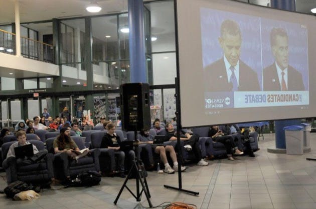 Students charged with political excitement filed into the Union Wednesday night, gearing up to watch President Barak Obama and Massachusetts Governor Mitt Romney duke it out in the first presidential debate of the 2012 election. With provided popcorn in hand and laptops open, students live tweeted and followed fact checking online as Obama and Romney debated numerous polices, the economy, healthcare and tax plans.