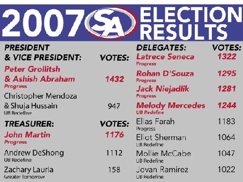 By JOSHUA BOSTON AND JAMES RAYMOND | Mar. 30, 2007After three days of flyer tossing and hand shaking, six of Progress party's seven candidates for office were elected as next year's Student Association leaders, including taking all three executive board spots - a far cry from last year's 10-vote victory margin.Peter Grollitsh, SA's current treasurer, and Ashish Abraham, current International Clubs Coordinator, took the organization's top spots Thursday night by 485 votes.