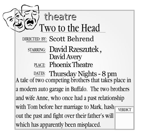 By CHRIS HUGHES | Apr. 25, 2005"Two to the Head" is described as a "modern Cain and Abel tale," and that is exactly what it is. It is a tale of two competing brothers that takes place in a modern auto garage in Buffalo.